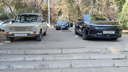 Ono što je takođe tipično za ceo Uzbekistan, naročito za ove velike gradove, jeste da ulicama voze gotovo isključivo skupi automobili, i to dva brenda. Američki Ševroleti Kija. Verovali ili ne, za evropske brendove kao da nikada nisu čuli. Devedeset devet procenata su novi, lepi automobili. Retko možete da naiđete na neku raspalu staru Ladu, koja je i dalje u voznom stanju. Naišao sam na jedan takav par i morao sam da ih ovekovečim.